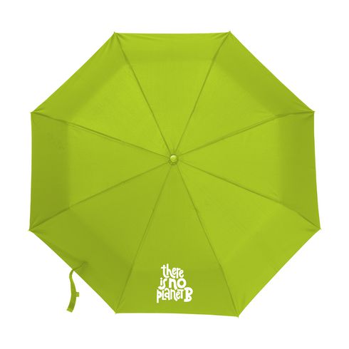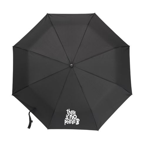 Sklopivi kišobran izrađen od 190T RPET pongee poliestera (od recikliranih PET boca). S drškom i ručkom od nehrđajućeg čelika, prekrasnim rukohvatom od bambusa s pamučnom omčom, kopčom na čičak, torbicom za pohranu i RPET etiketom. Ručna operacija.