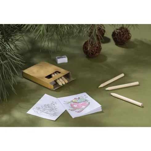 Set se sastoji od 6 bojica, 8 stranica za bojanje s božićnim motivima i šiljila. Sve je zapakirano u malu kartonsku kutiju. Ovaj set zasigurno će djeci učiniti čekanje Božića ugodnijim.