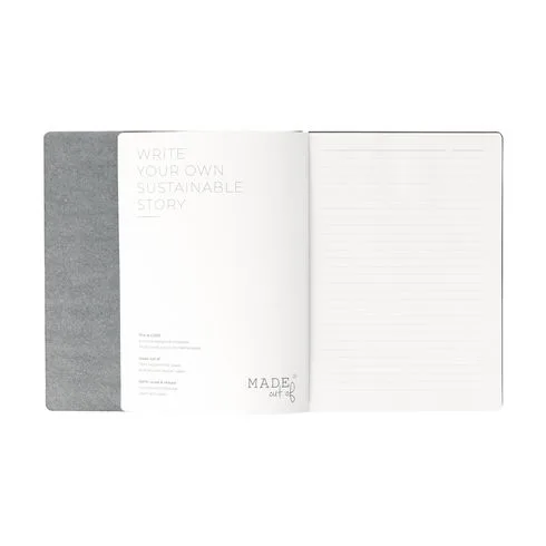 A5 notebook ima korice izrađene od ostataka drugih recikliranih tekstilnih proizvodnji: 70% viška trapera, 25% veziva i 5% biljnih dodataka. Ovaj notebook s elastičnim zatvaračem ima odvojivi blok koji se može zamjeniti, a sastoji se od približno 120 listova/240 stranica recikliranog, FSC-certificiranog papira s linijama. Ovaj papir je proizveden koristeći CO2-neutralan proces. Blok je pričvršćen čvrstom elastičnom trakom. Fina vlakna čine fleksibilan materijal korica usporedivim s pravom kožom. 100% je reciklabilan i može se ponovno koristiti više puta. Proizvedeno u Nizozemskoj.