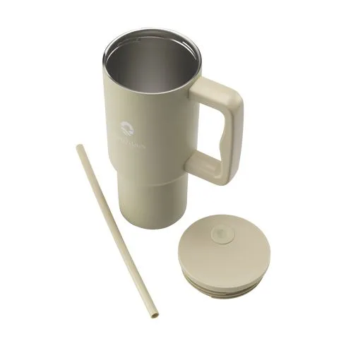 Großer, doppellagiger Becher aus recyceltem Edelstahl mit einem Strohhalm. Der auffällige, stabile Becher hat einen großen Kunststoffgriff und einen Deckel mit einem Loch für den mitgelieferten Plastikstrohhalm. Dieser große Becher hält die Temperatur des Getränks länger. Er eignet sich für kalte und heiße Getränke. Ideal für das Fitnessstudio oder Büro. Dank des spitz zulaufenden, schmalen Bodens passt der Becher in fast jeden Getränkehalter und ist somit perfekt für unterwegs. Nicht spülmaschinenfest. RCS-zertifiziert. Gesamtanteil an recycelten Materialien: 75 %.