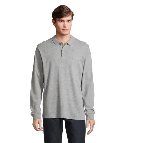 Unisex polo majica od 100% organskog pamuka. Siva melange: 85% organski pamuk, 15% viskoza. Charcoal melange: 60% organski pamuk, 40% reciklirani poliester. Stil: rebrasti ovratnik s trakama, ojačana kopčica s 2 gumba, dugi rukavi s rebrastim manšetima te rezervni gumb ušiven na unutarnji bočni šav.